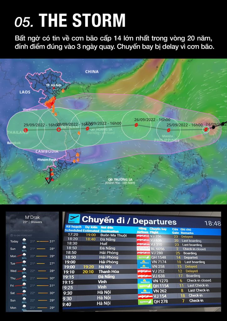 Dự báo thời tiết trên tất cả các app như Apple Weather, Windy cho thấy có bão áp thấp nhiệt đới kéo dài trong nhiều tuần tới. Đây chính là khó khăn lớn nhất của toàn bộ Production, khiến toàn bộ lịch quay booking của diễn viên, crew và thiết bị thay đổi.